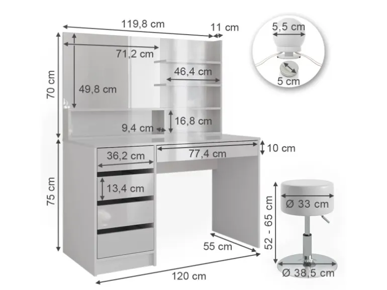 Frisierkommode: 120x75x55 cm (BxHxT), 40,4 kg. Regal: 119,8x70x11 cm, Spiegel: 71,2×49,8 cm