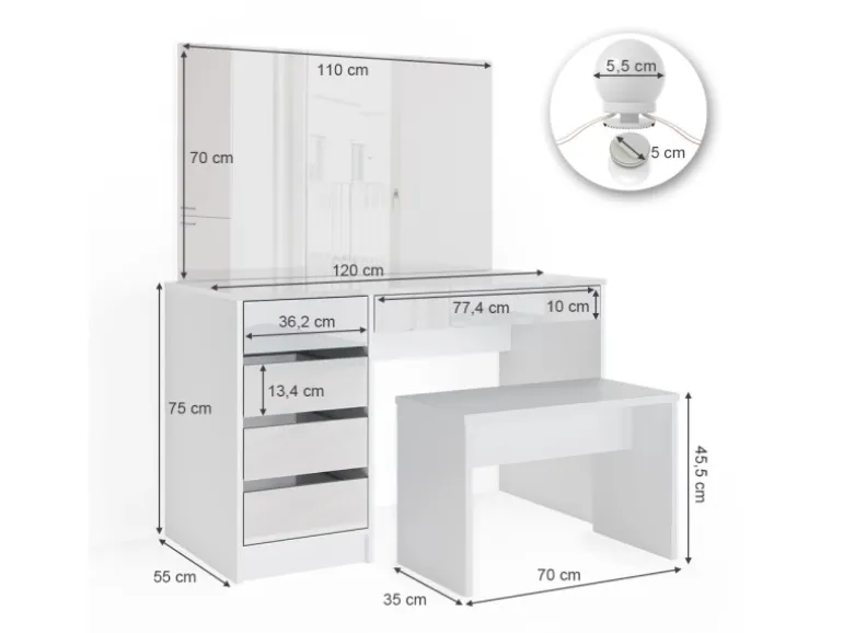 Der Schminktisch hat eine Breite von 120 cm, eine Höhe von 75 cm und eine Tiefe von 55 cm