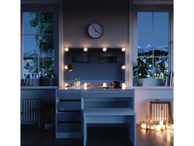 LIEFERUMFANG: Schminktisch, Sitzbank, LED-Lichterkette, Montageanleitung, Montagematerial.