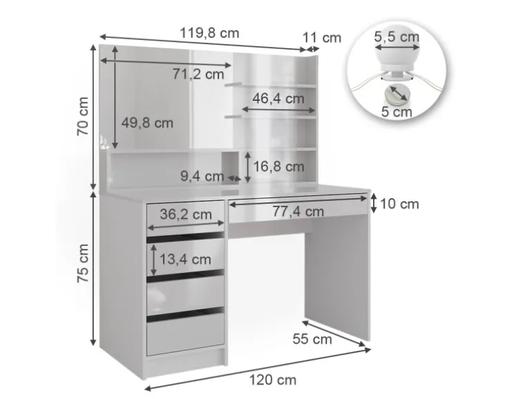 Frisierkommode: 120x75x55 cm (BxHxT), 40,4 kg. Regal: 119,8x70x11 cm, Spiegel: 71,2×49,8 cm