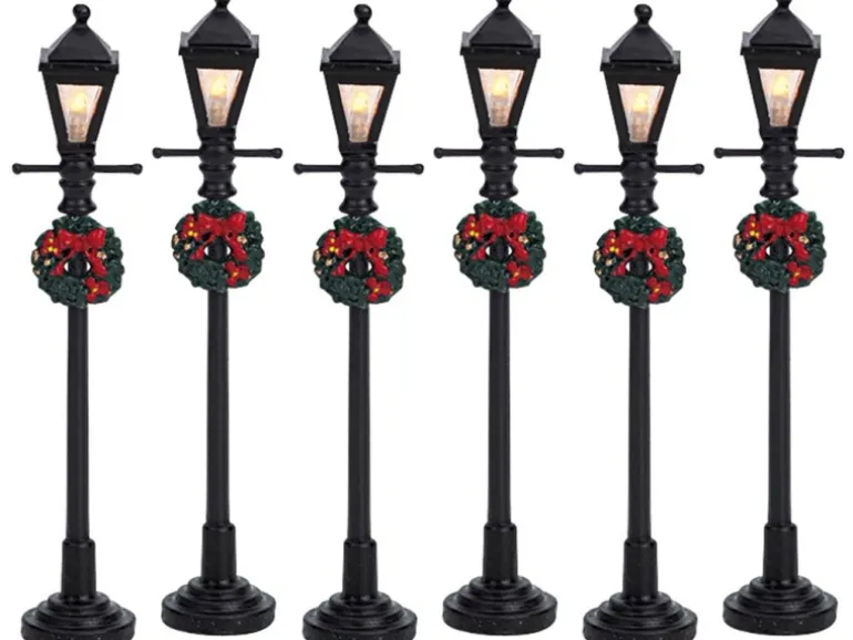 6 Straßenlaternen mit Weihnachtskranz, warmweiße LED