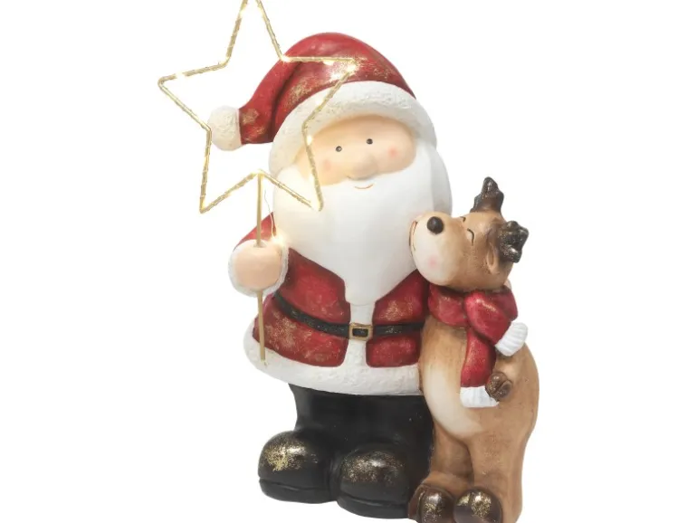 Weihnachtsmann mit Rentier und beleuchtetem goldfarbenem Stern