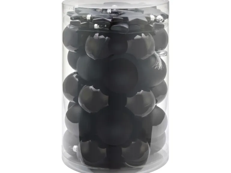 34 Kugeln (60 mm Durchmesser) und 16 Sterne (54 mm x 62 mm) aus schwarzem, mattiertem Kunststoff