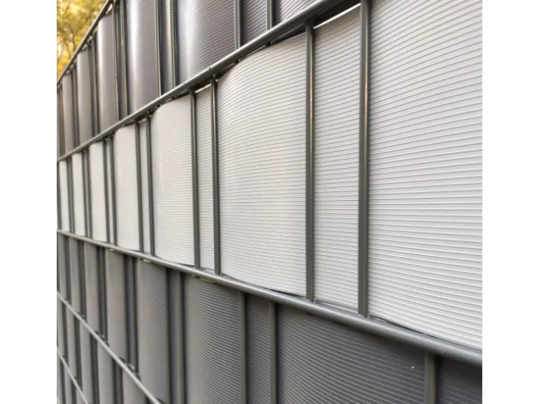 Streifen passen perfekt in handelsübliche Doppelstabmattenzäune.